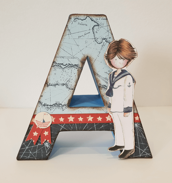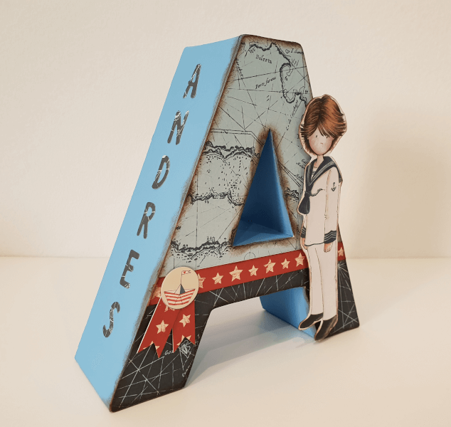 Letra de cartón Decorada Océano, de 17 cm. Va decorada a juego con tu libro de firmas. La puedes utilizar para decorar la mesa dulce, y una vez terminada la Comunión, de decoración para la habitación de tu hijo.